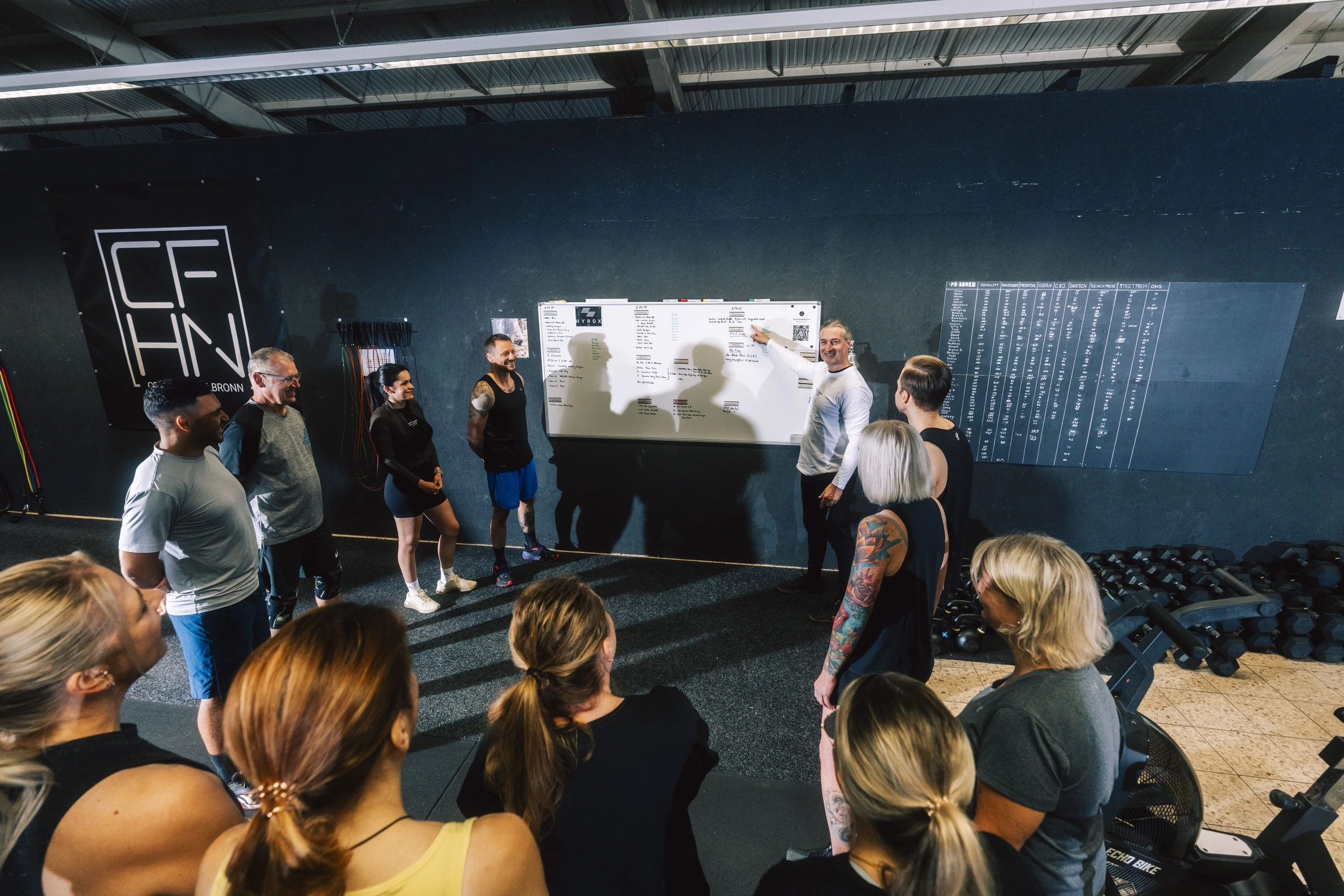 Ein Coach steht mit dem Rücken zur Kamera vor einer Gruppe Sportler in der CrossFit-Box Heilbronn.